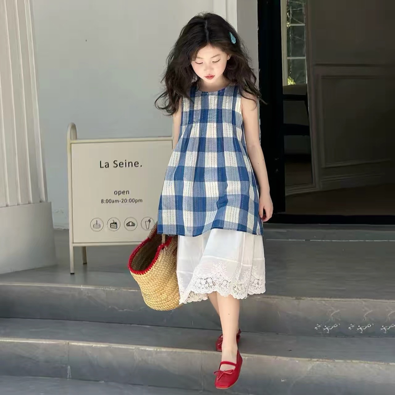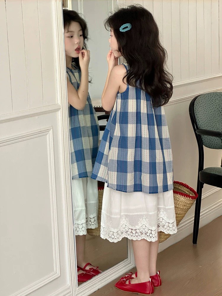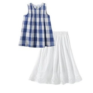 夏款韓版藍色格紋上衣+白色花邊裙二件套裝