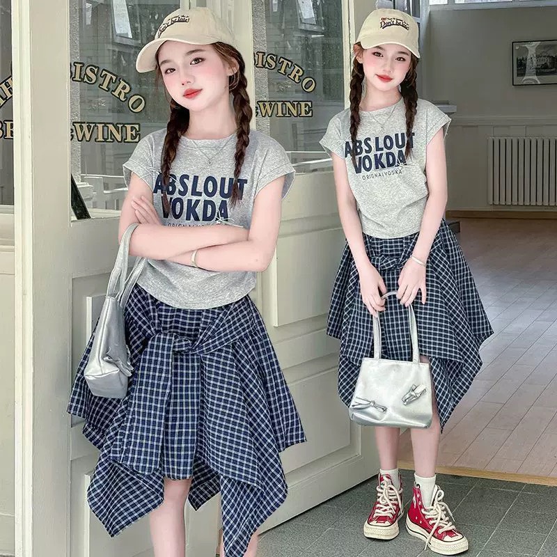 夏款中大童韓版灰色上衣+不規則格子裙二件套裝