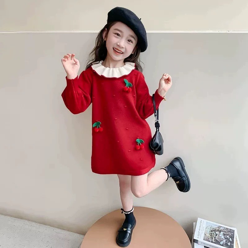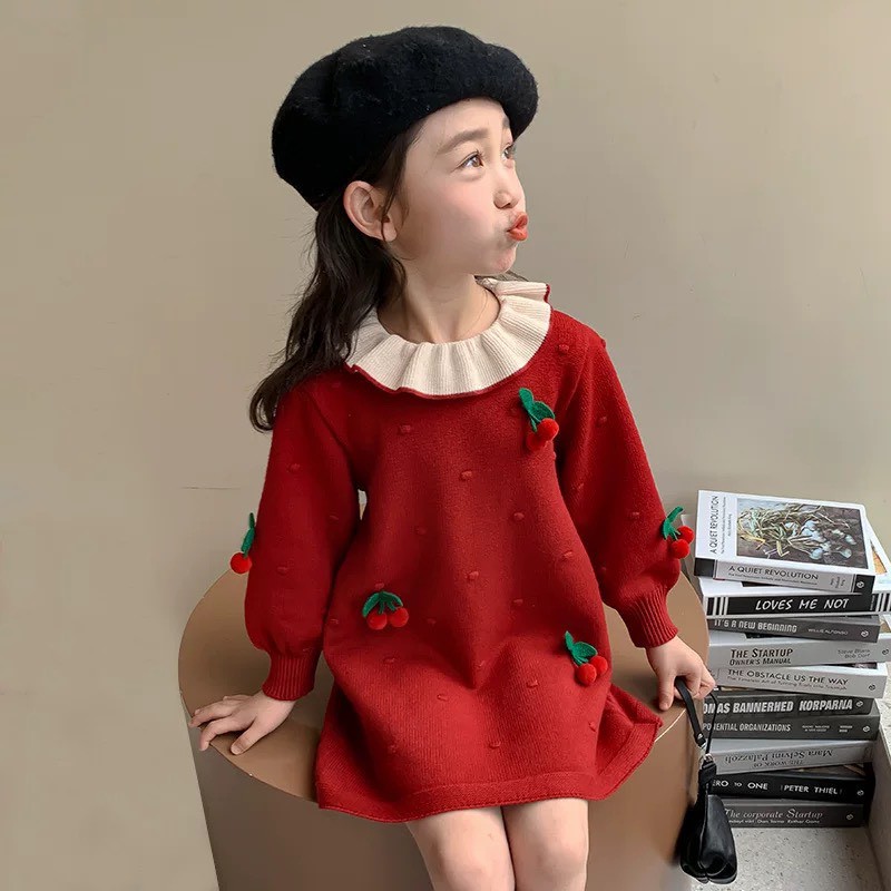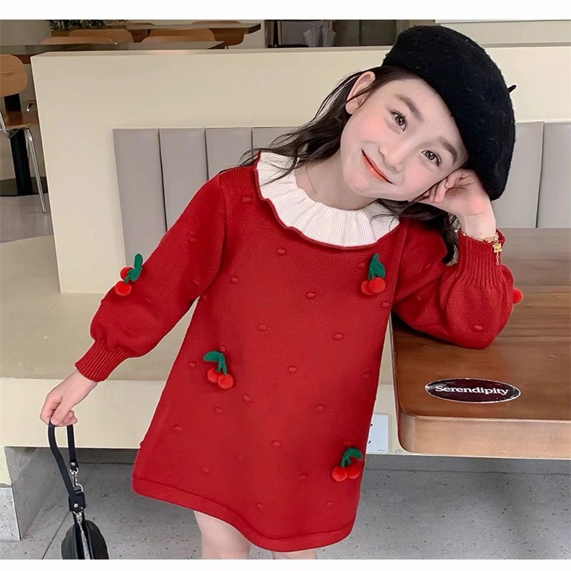 秋冬款韓版新年紅色針織櫻桃連衣裙