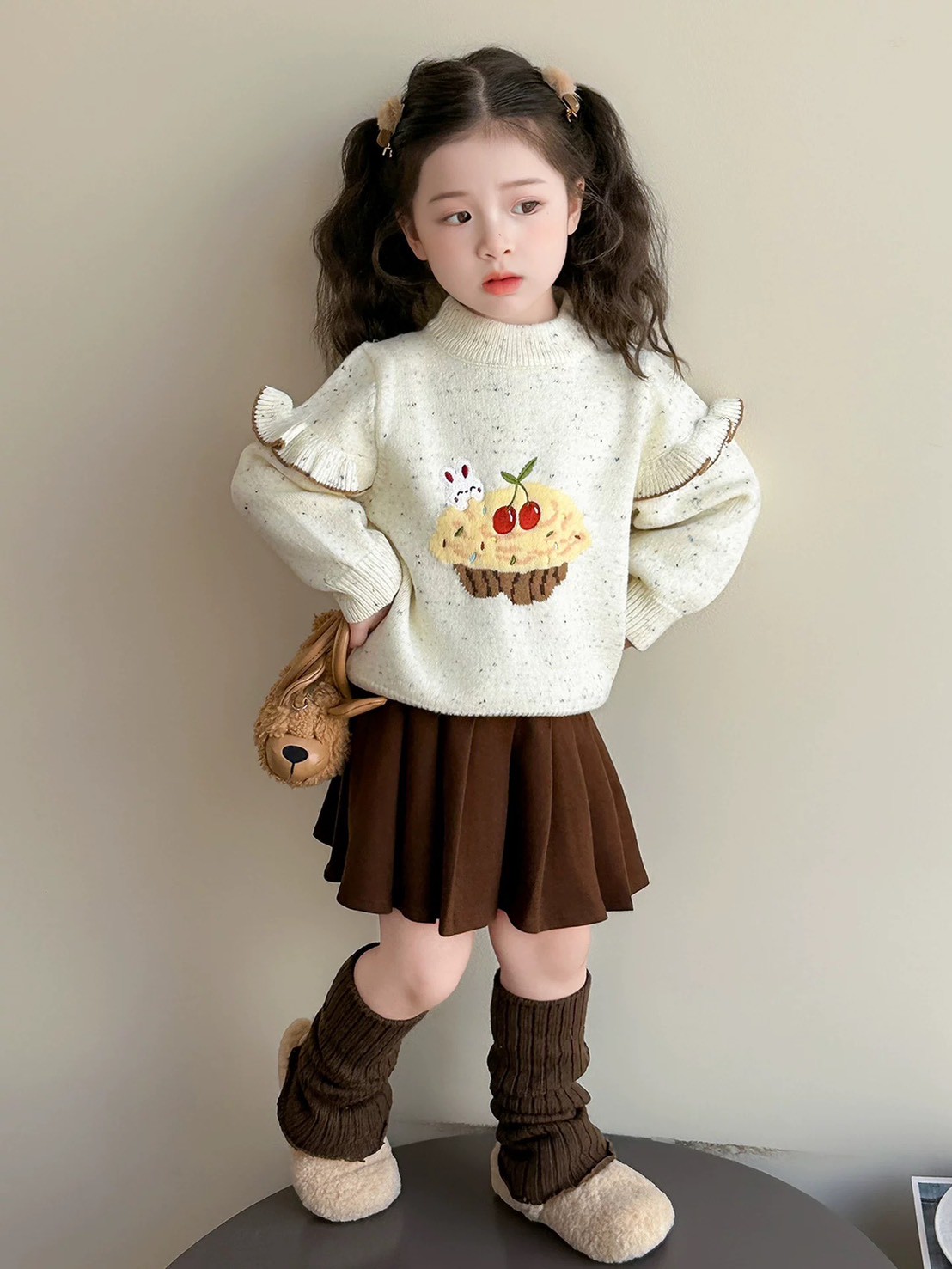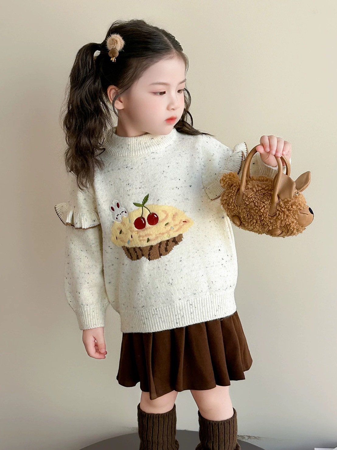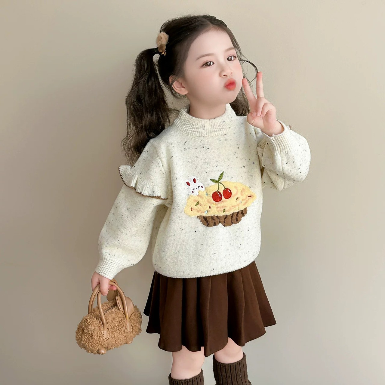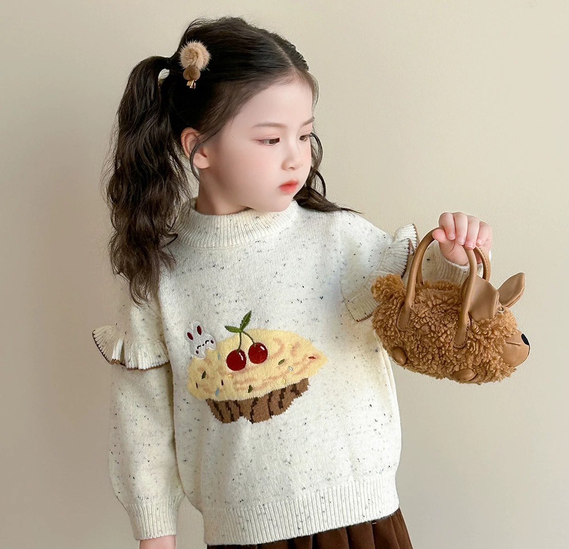 秋冬款韓版荷葉邊可愛櫻桃蛋糕毛衣/針織上衣(米色)